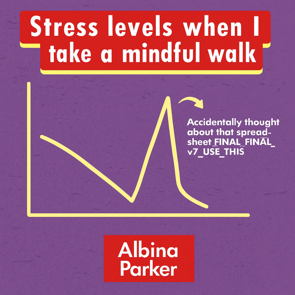 I went for one of those gentle, don’t‑need‑a‑playlist walks. The kind where your shoulders finally drop and your brain turns from static to birdsong. Three minutes in, serenity arrives. Five minutes in, I inhale like I’ve remembered how to be a person. At minute seven, I accidentally think of the spreadsheet named FINALFINALv7USETHIS and - boom - my heart does parkour.