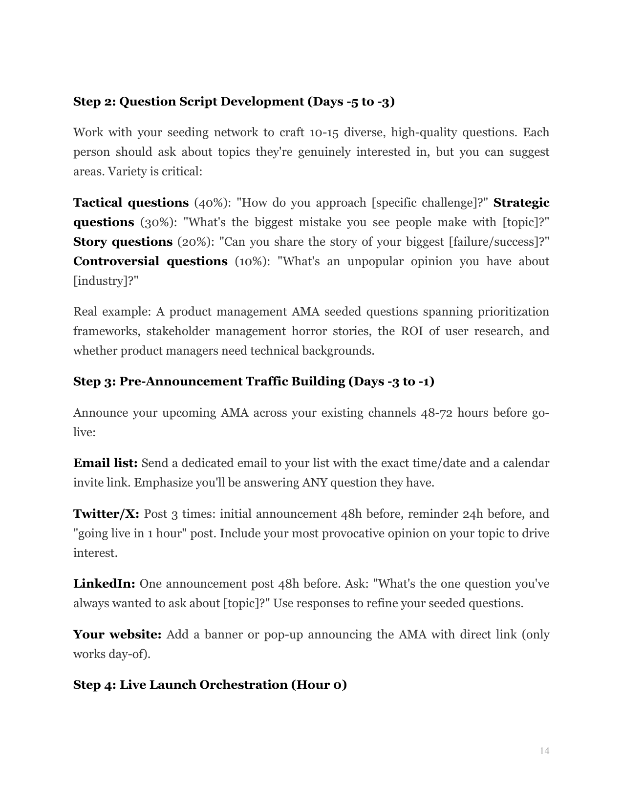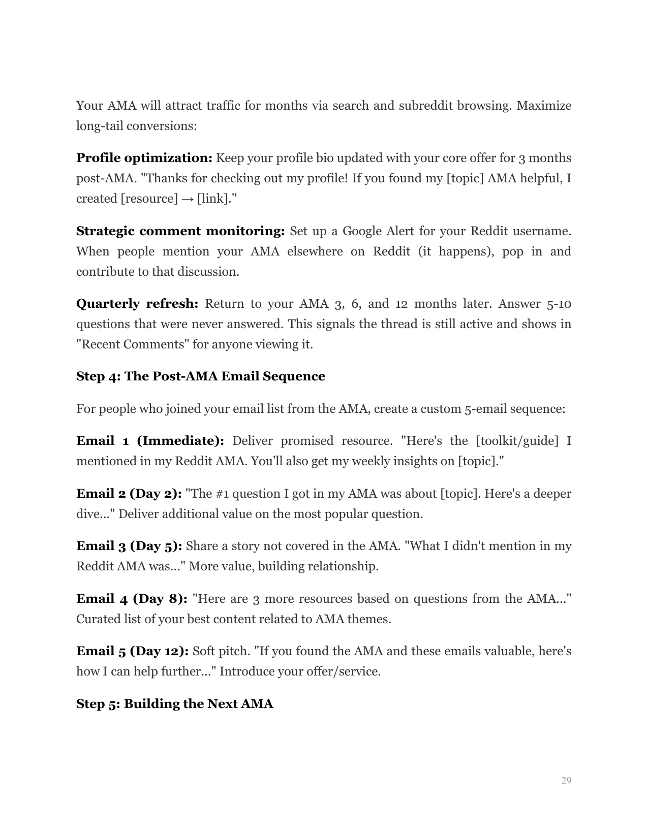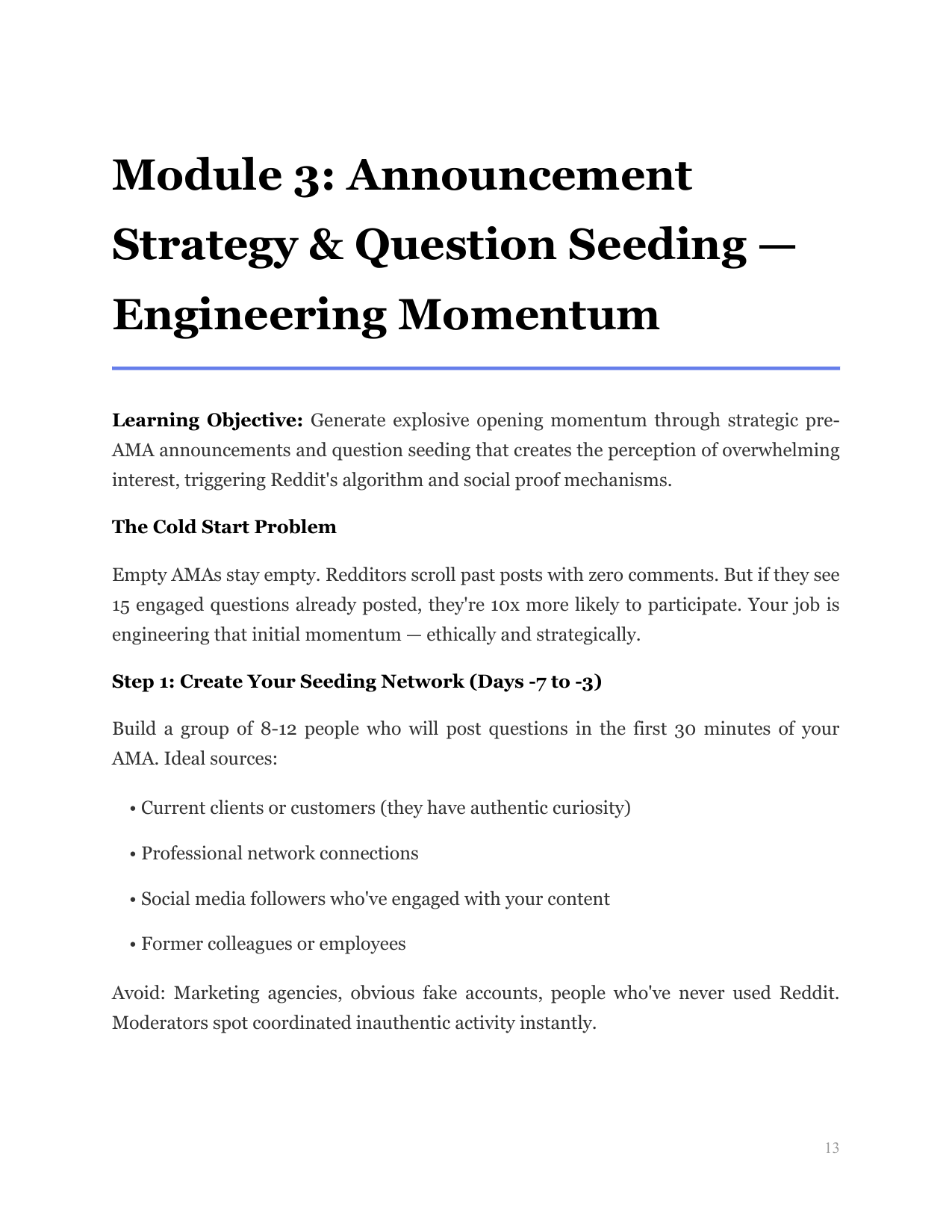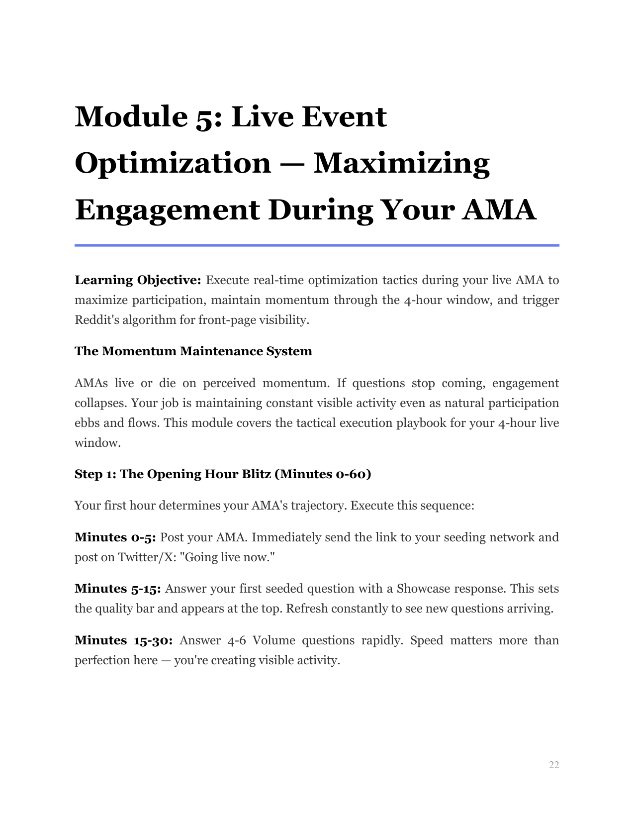 Leverages Reddit's signature format for authority building. Covers subreddit approval process, announcement timing, question seeding, response frameworks, and post-AMA traffic capture that converts attention into audience.