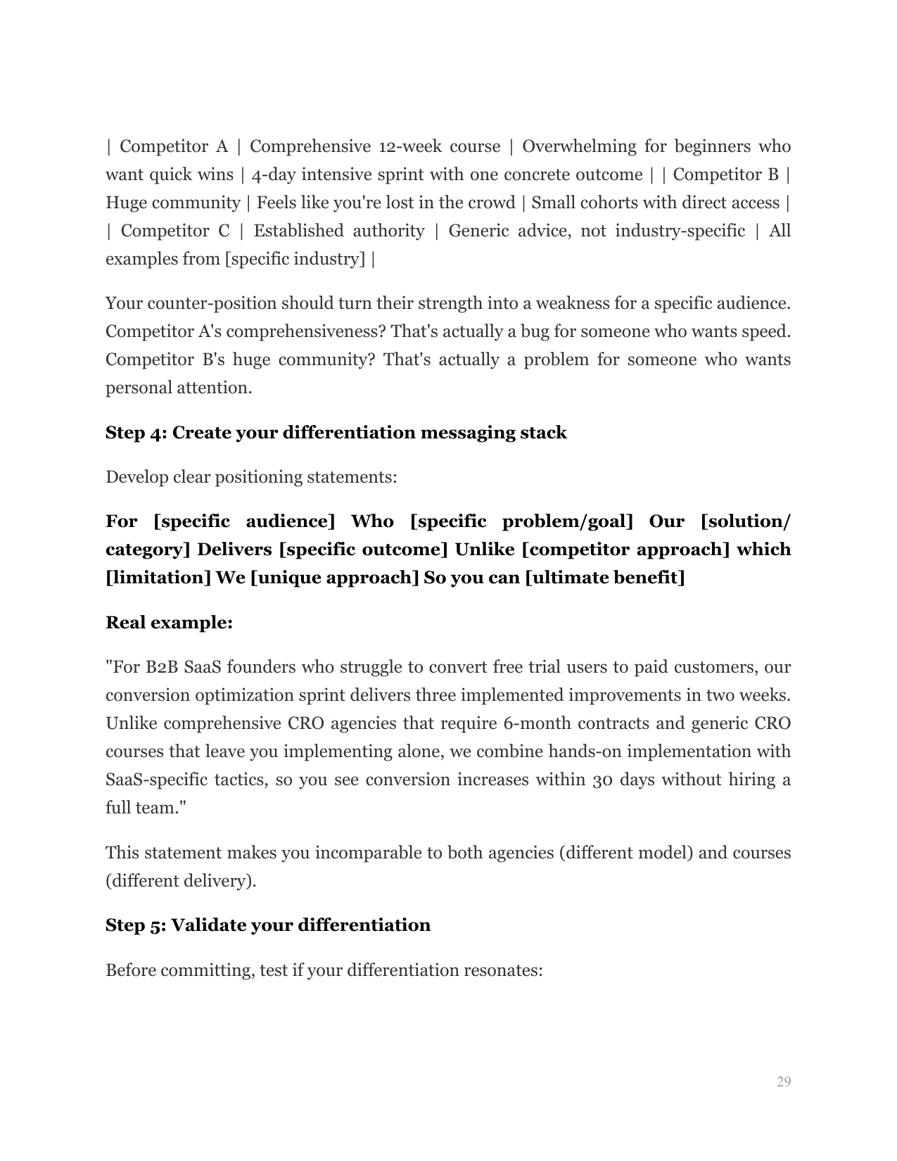 Transform competitive intelligence into a unique market position that makes direct comparison impossible and makes you the obvious choice for a specific audience.
