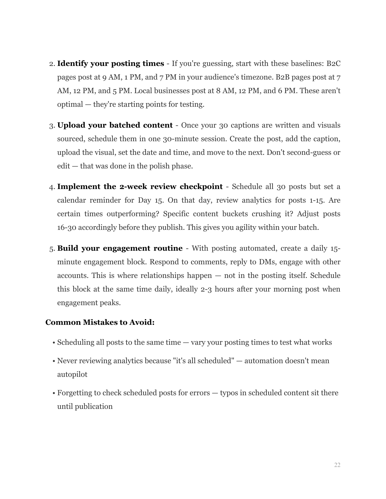 Set up automated posting systems and strategic scheduling approaches that ensure consistent publishing without daily management.