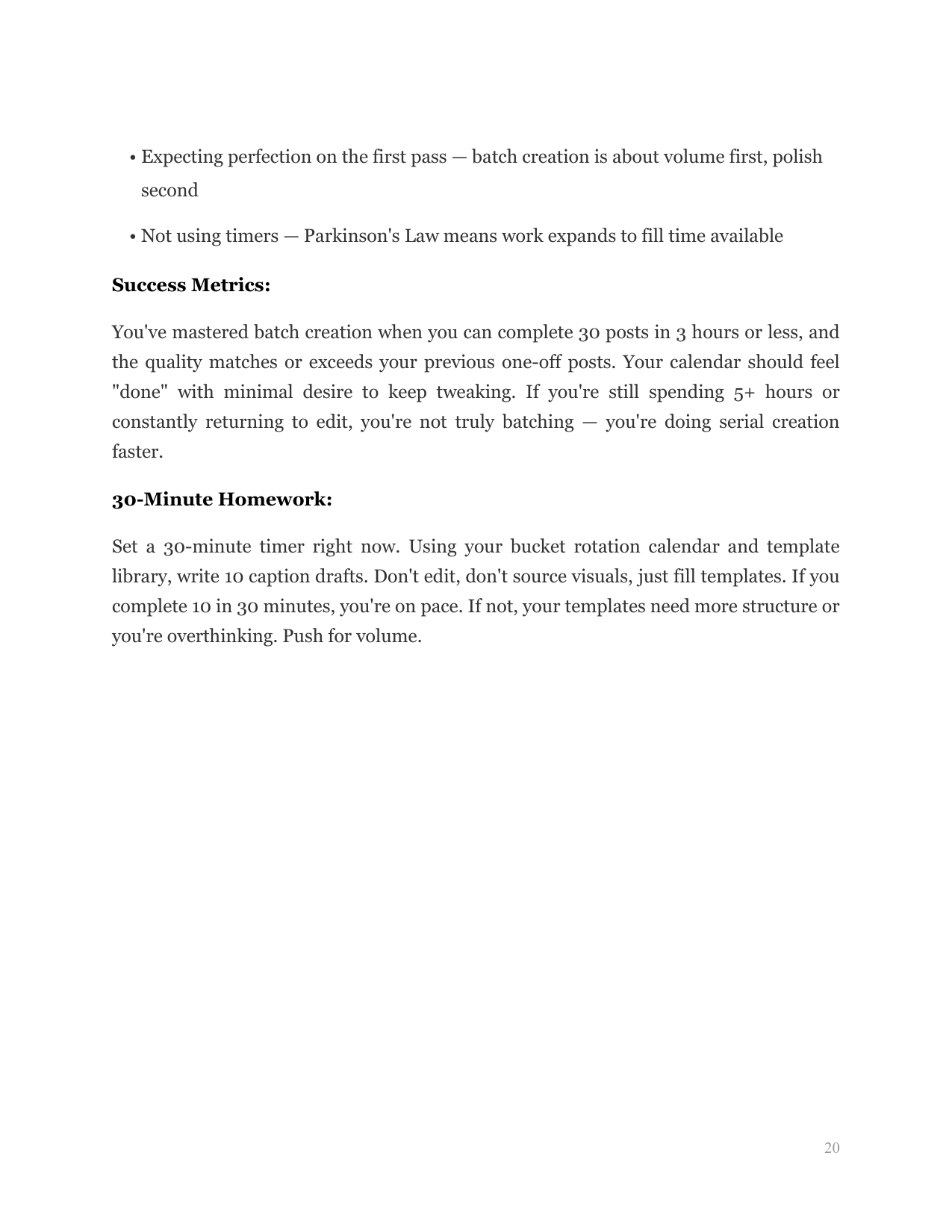 Master the batch creation process that lets you produce 30 high-quality posts in a single focused session instead of scattered daily creation.