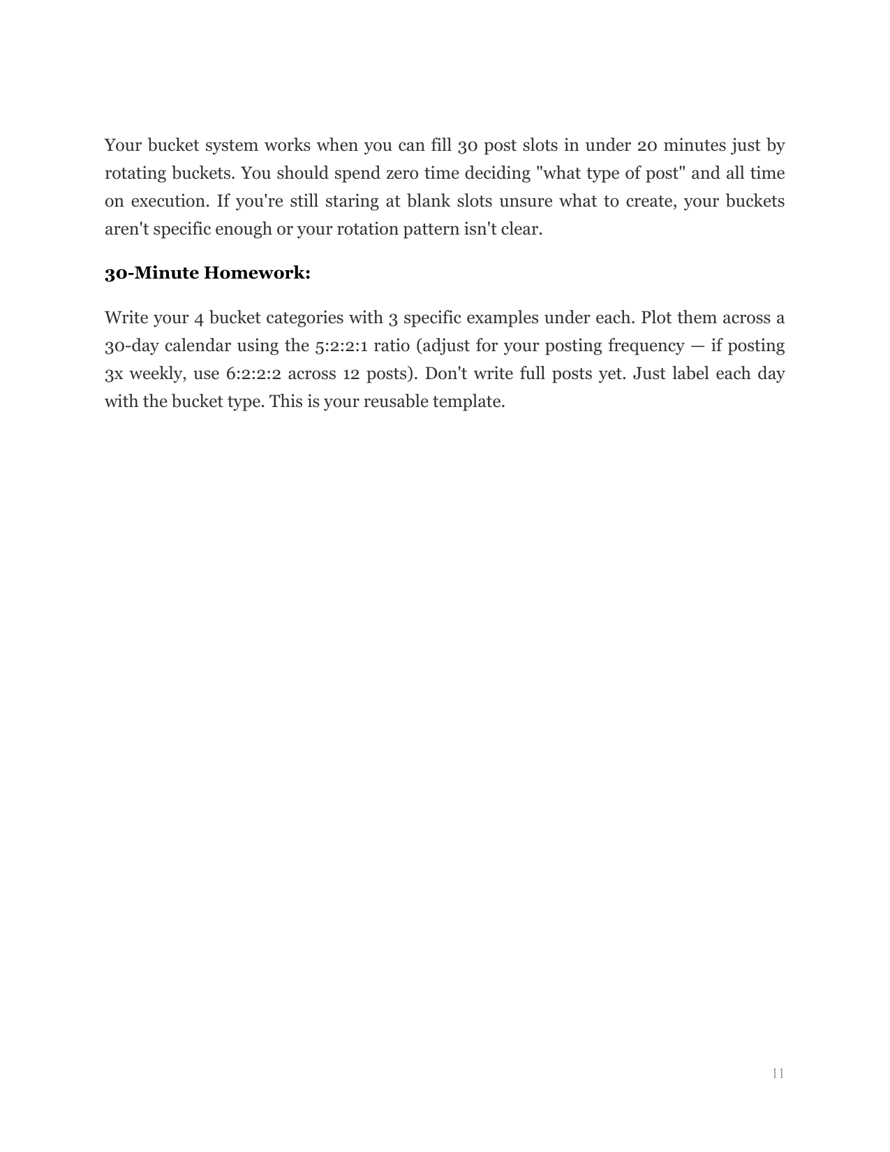 Master the bucket rotation system that generates 30 days of strategically balanced content in minutes, not hours.