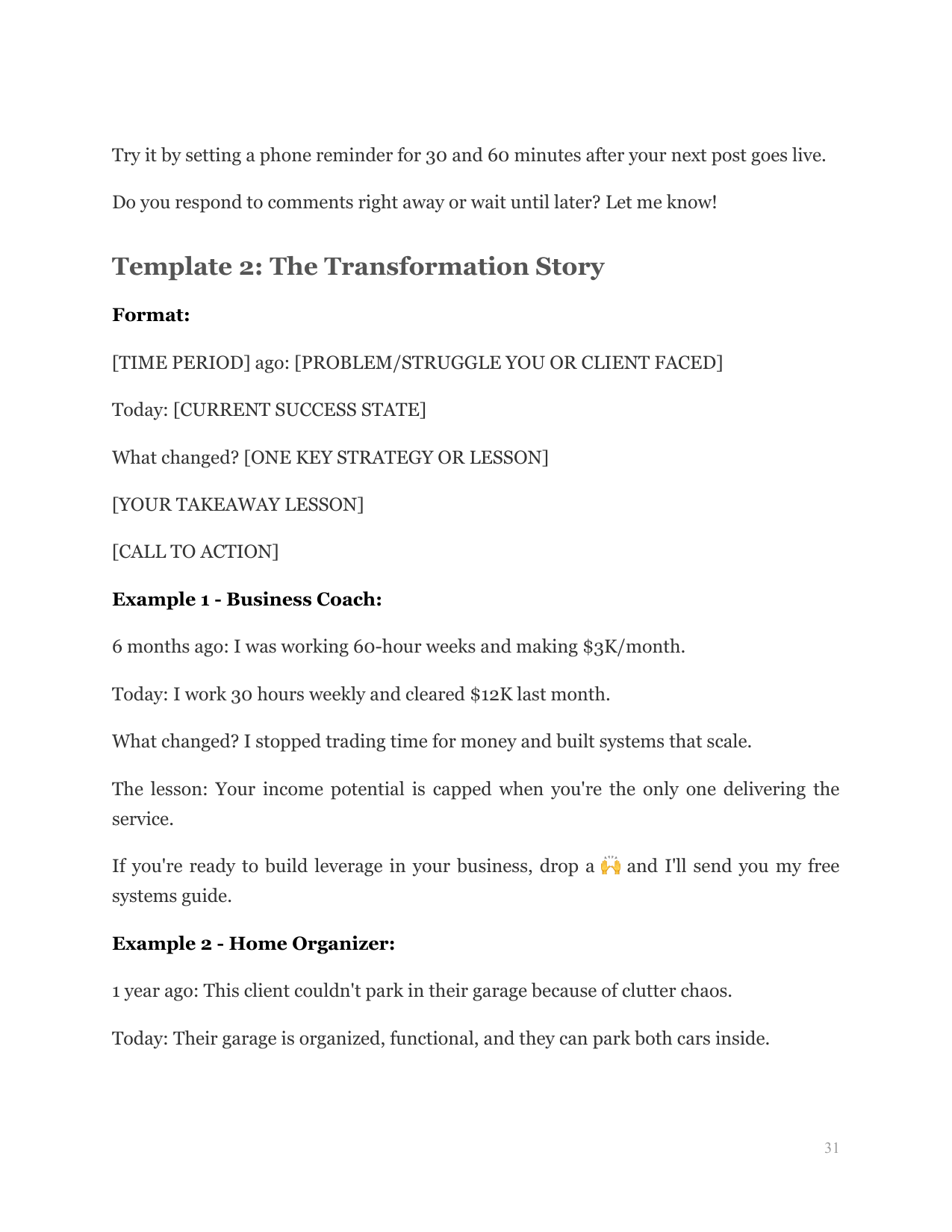 Use proven caption templates that turn content creation from 30 minutes per post to 3 minutes per post through strategic fill-in-the-blank frameworks.