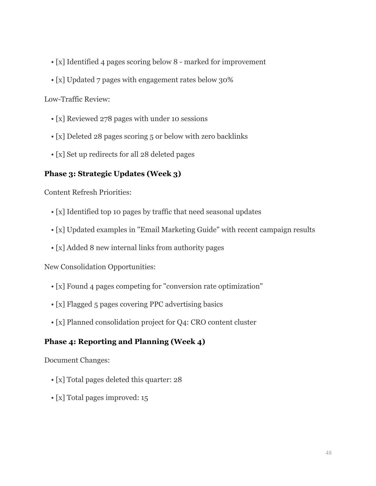 Develop a systematic scoring method to categorize every page as Keep, Improve, Consolidate, or Delete without emotional attachment to content.