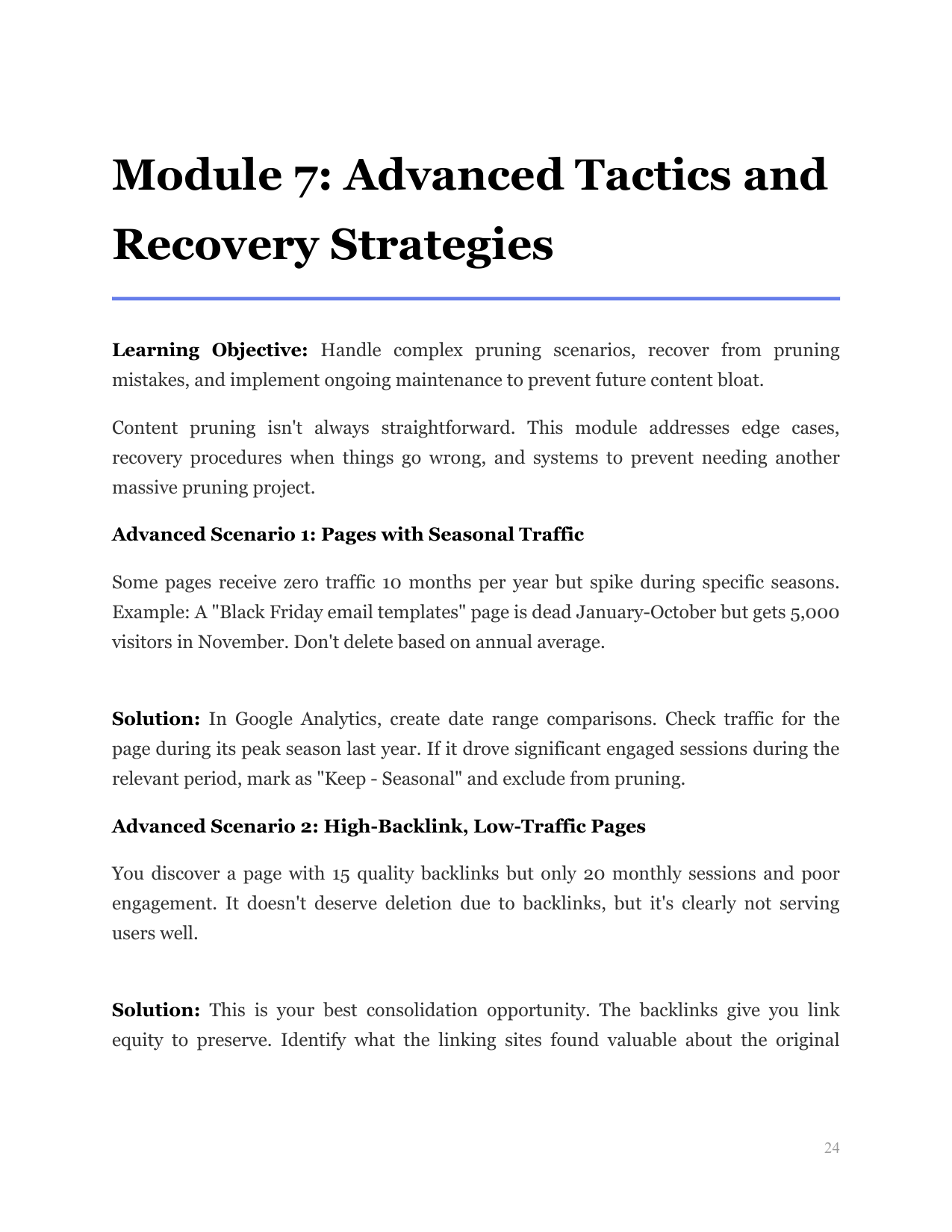 Removes content that hurts rankings. Teaches quality assessment, consolidation vs. deletion decisions, and redirect mapping that strengthens overall site performance.