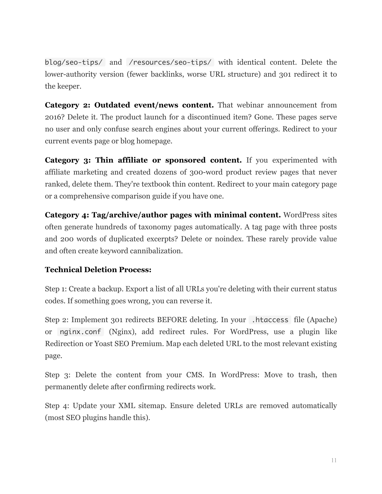 Identify deletion candidates and execute removals while preserving SEO value through proper technical implementation.