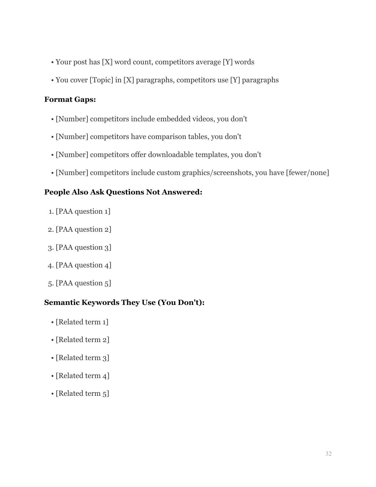 Systematically identify what your competitors added that you're missing, using forensic comparison techniques that reveal specific rankable improvements.