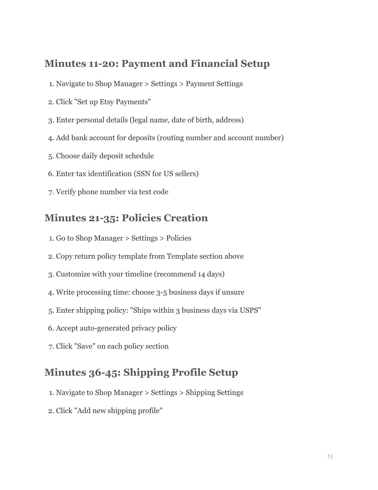 Eliminates setup paralysis for complete beginners. Covers shop naming strategy, about section templates, policies that build trust, payment setup, and the 'minimum viable shop' approach that gets you selling fast without overthinking.