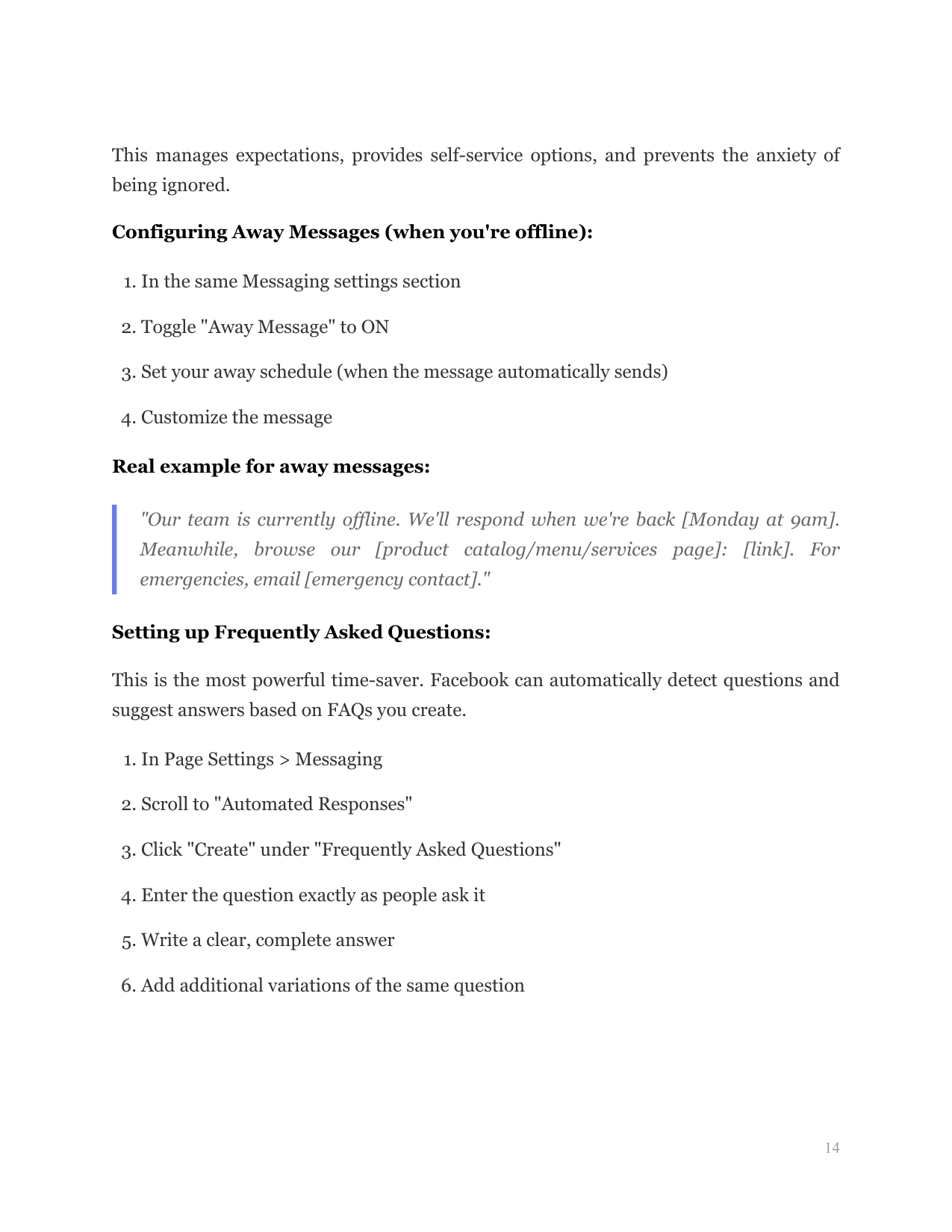 Eliminates time-sink page management. Covers admin role delegation, Creator Studio scheduling, auto-response setup, saved replies, and moderation tools that maintain presence without constant monitoring.
