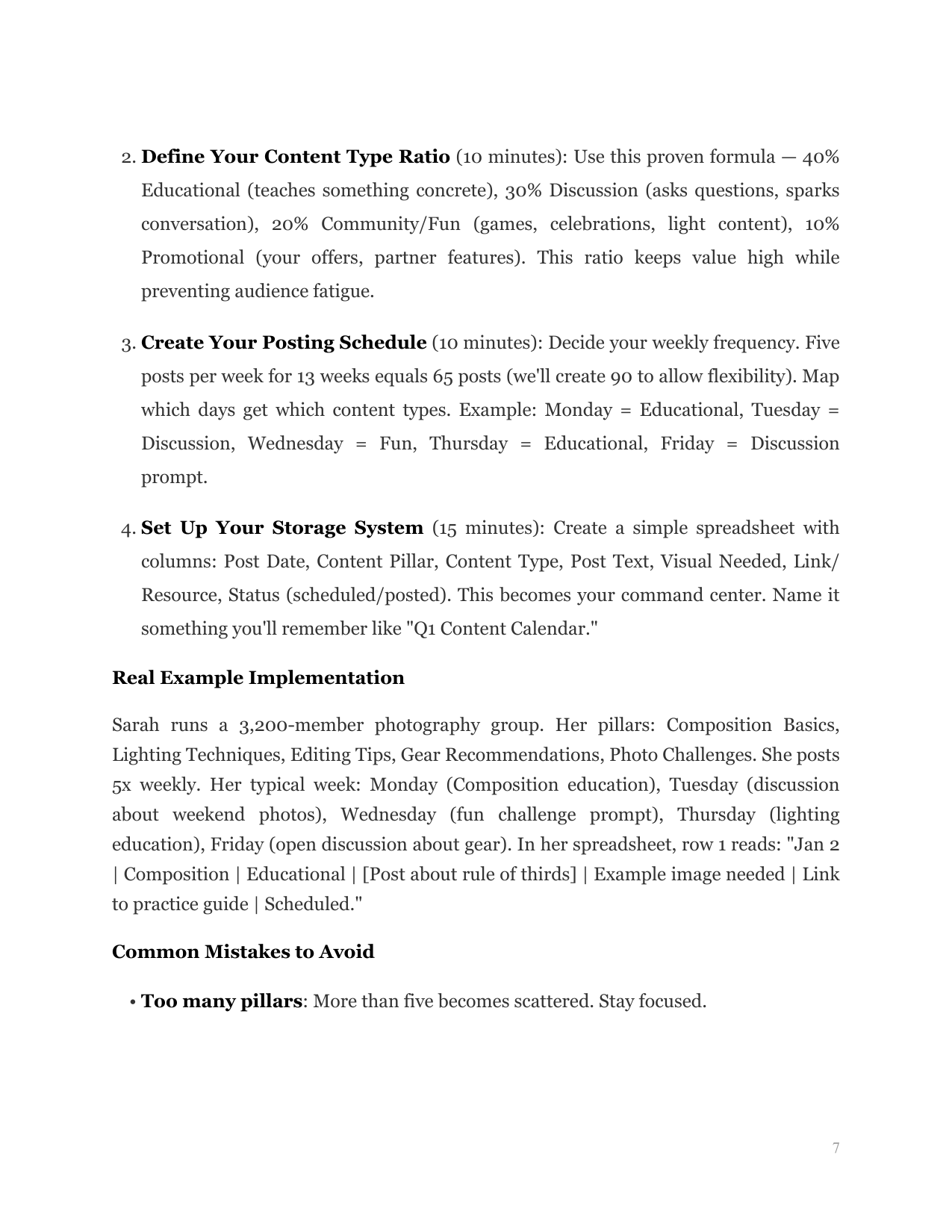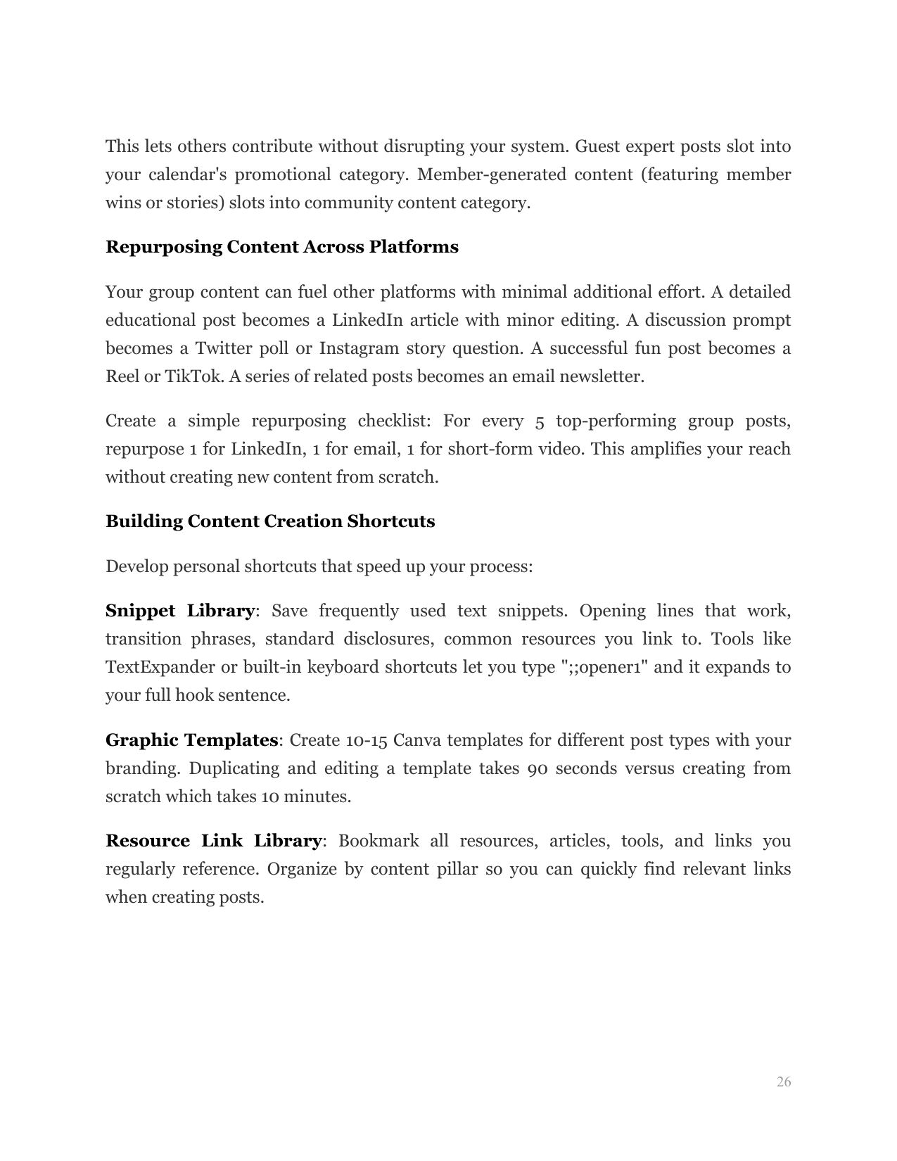 Removes daily 'what should I post?' paralysis. Provides template library across content types (education, discussion, fun, promotion), batch creation method, recycling system, and the 'content pillars' framework for consistent value delivery.