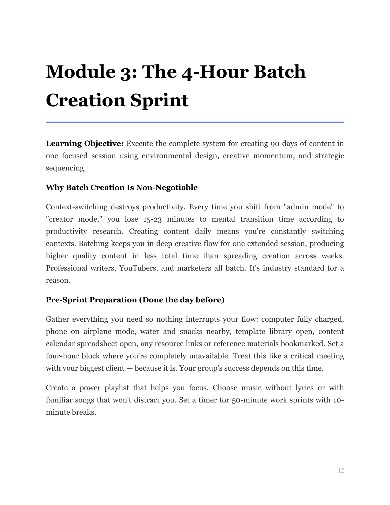 Execute the complete system for creating 90 days of content in one focused session using environmental design, creative momentum, and strategic sequencing.