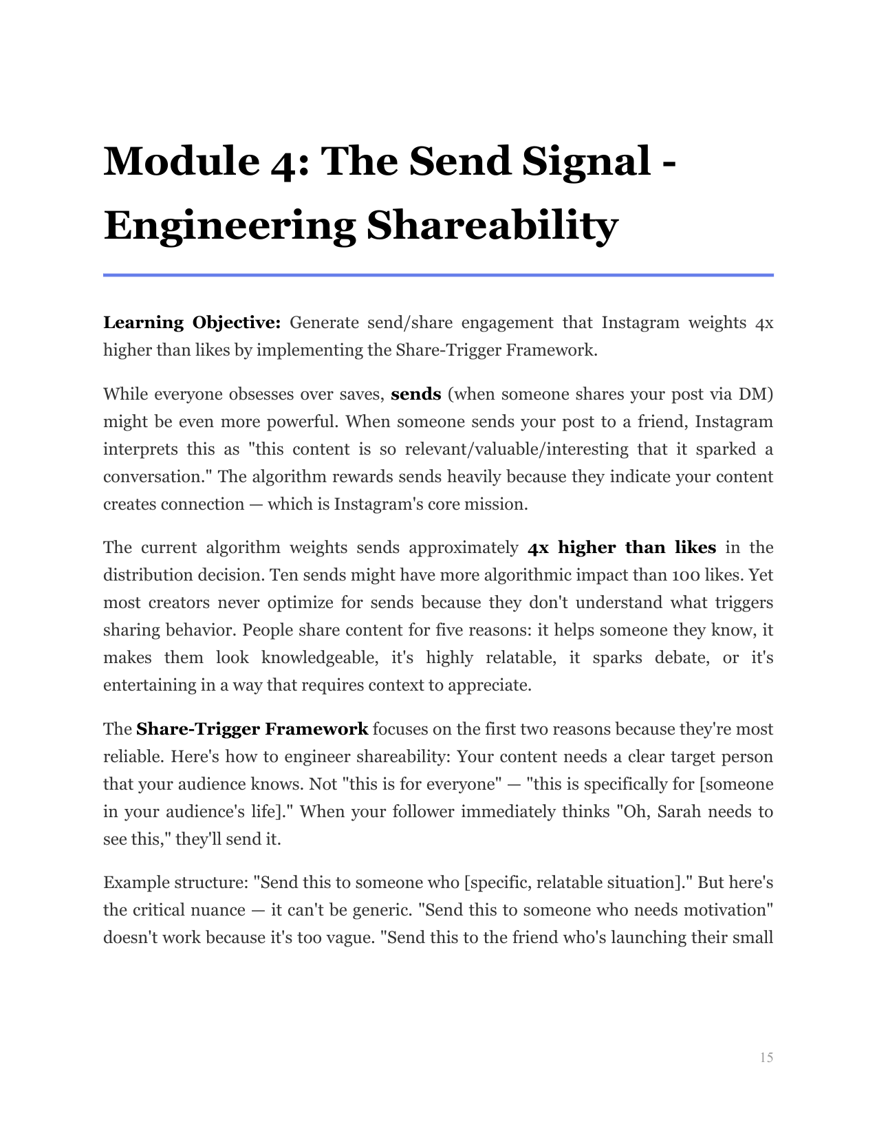 Generate send/share engagement that Instagram weights 4x higher than likes by implementing the Share-Trigger Framework.