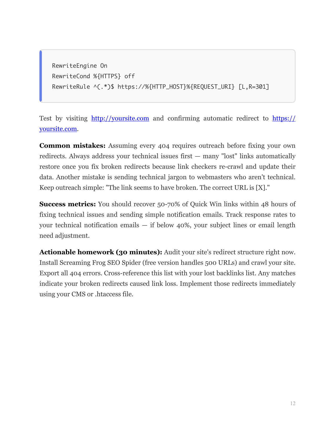 Fixes broken external links pointing to your site. Covers backlink monitoring with free tools, redirect setup, and outreach templates that restore lost link equity.