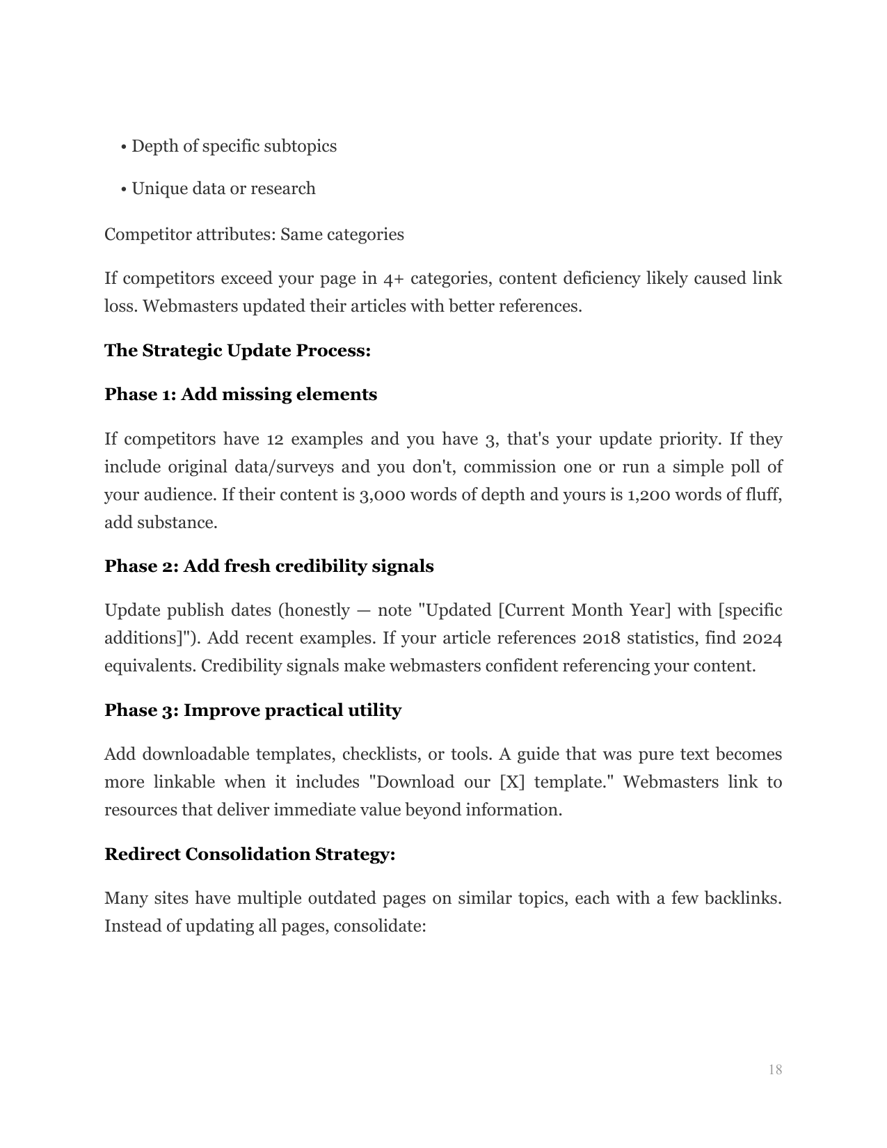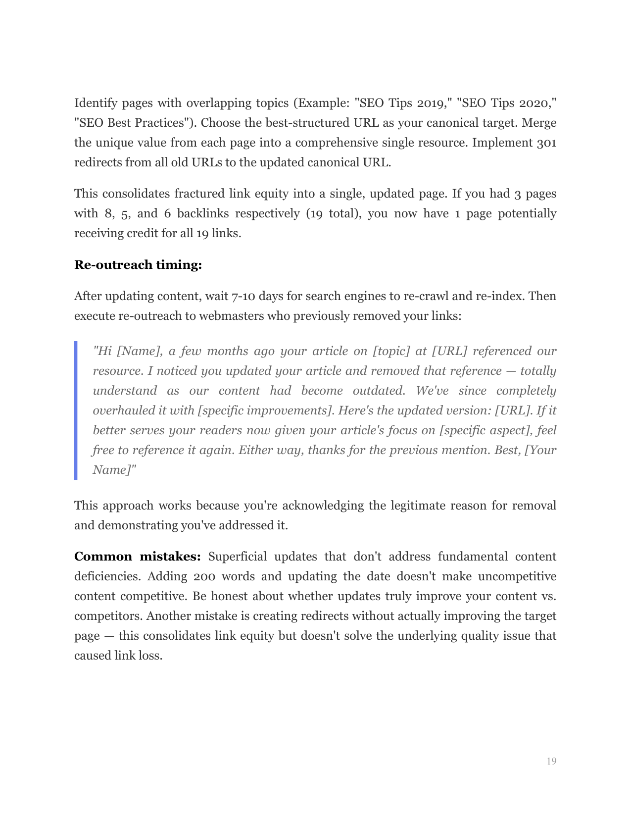 Identify which of your pages lost links due to content quality issues, execute strategic updates that make them re-linkable, and implement redirect consolidation that recovers lost authority from similar outdated pages.