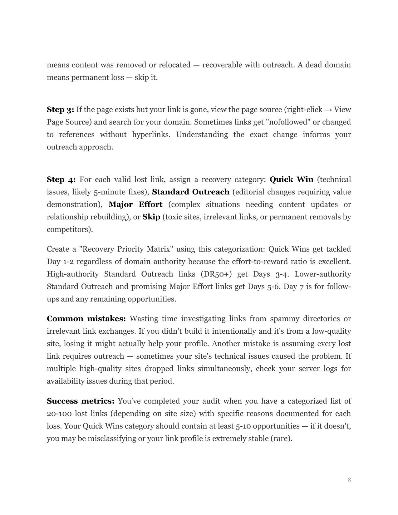Recover 40-60% of your "Quick Win" lost links within 48 hours by addressing technical issues on your site and the referring sites, without requiring extensive outreach.