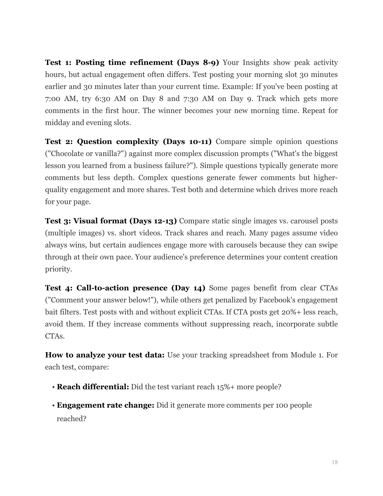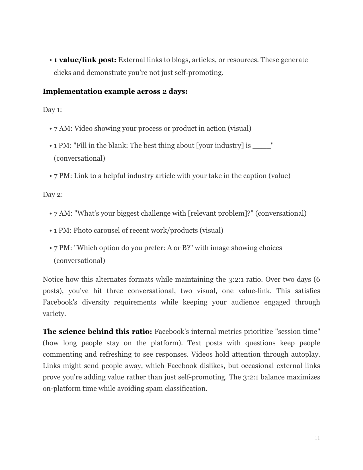 Solves the dying organic reach problem. Teaches the posting frequency formula, content mix ratios, engagement bait techniques, and the 'prime time' publishing strategy that beats the algorithm.