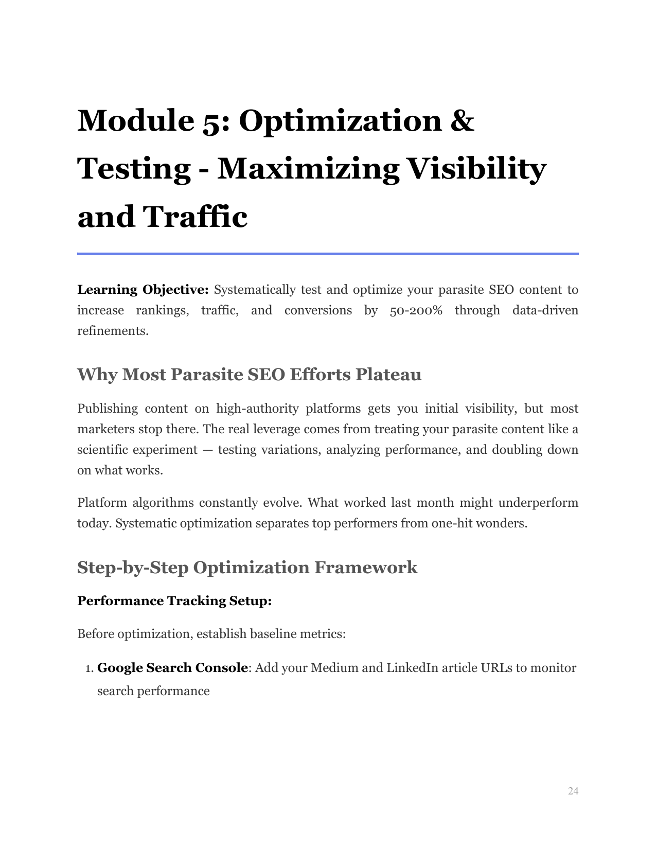 Systematically test and optimize your parasite SEO content to increase rankings, traffic, and conversions by 50-200% through data-driven refinements.