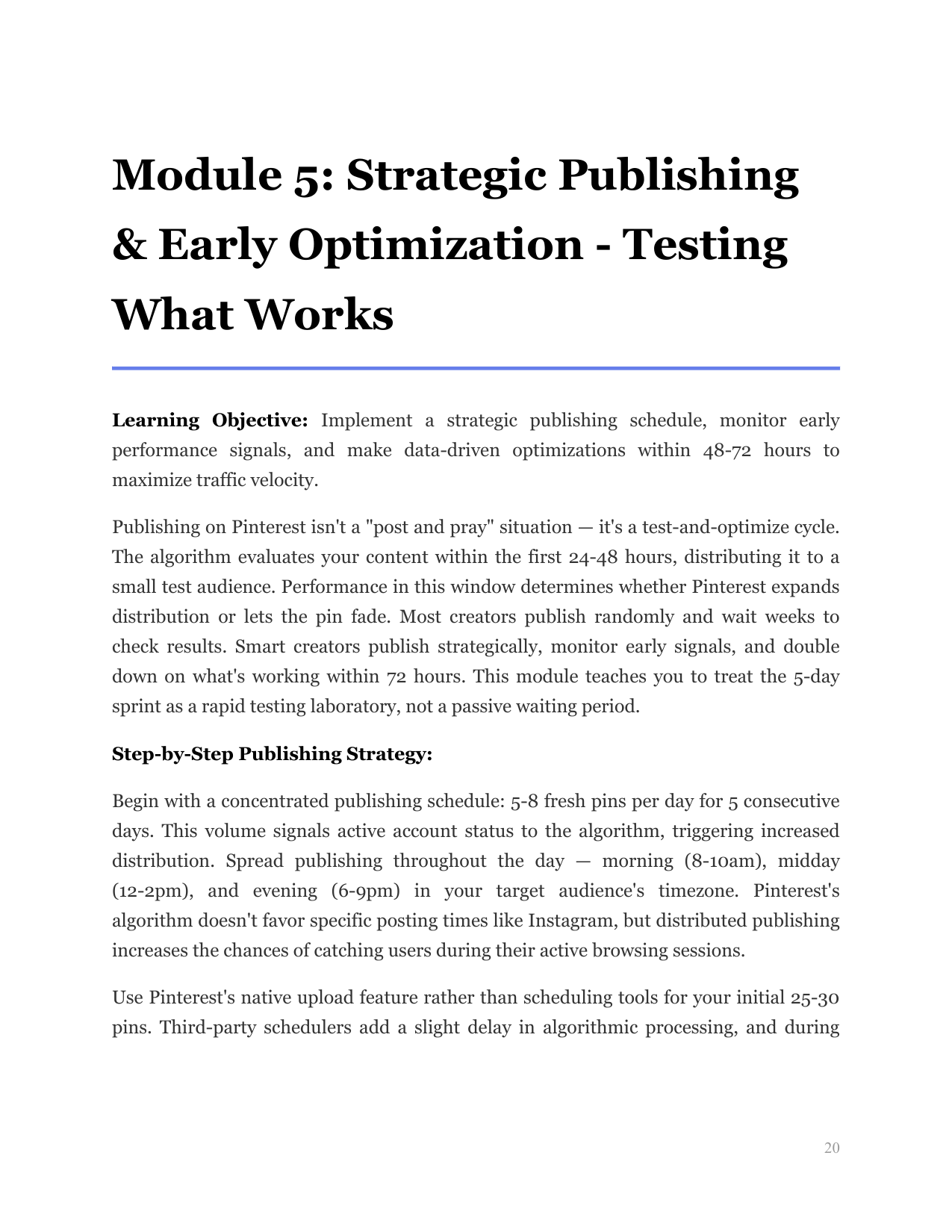 Implement a strategic publishing schedule, monitor early performance signals, and make data-driven optimizations within 48-72 hours to maximize traffic velocity.