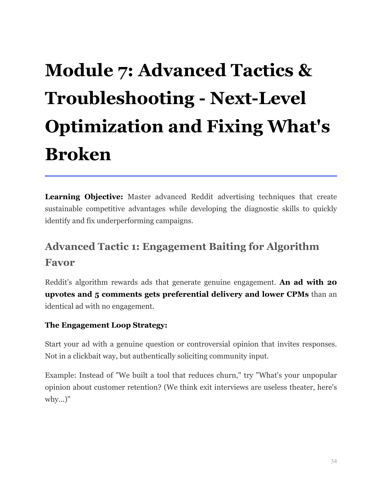 Master advanced Reddit advertising techniques that create sustainable competitive advantages while developing the diagnostic skills to quickly identify and fix underperforming campaigns.