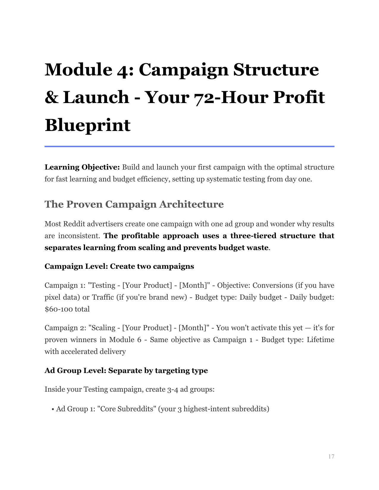 Build and launch your first campaign with the optimal structure for fast learning and budget efficiency, setting up systematic testing from day one.