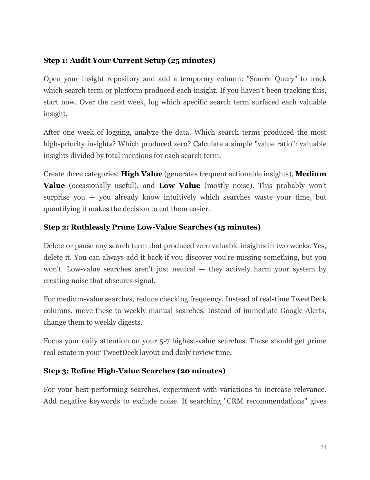 You'll learn to identify which search terms, platforms, and time investments produce the highest value insights, then systematically eliminate noise while amplifying signal.