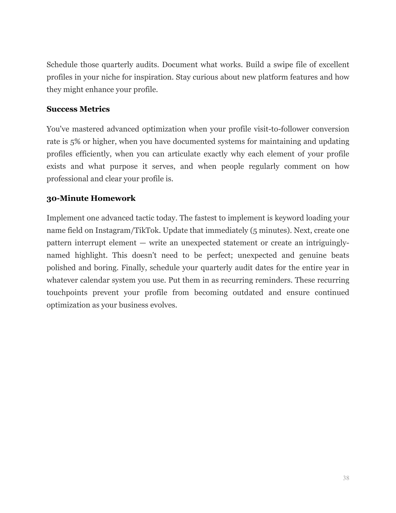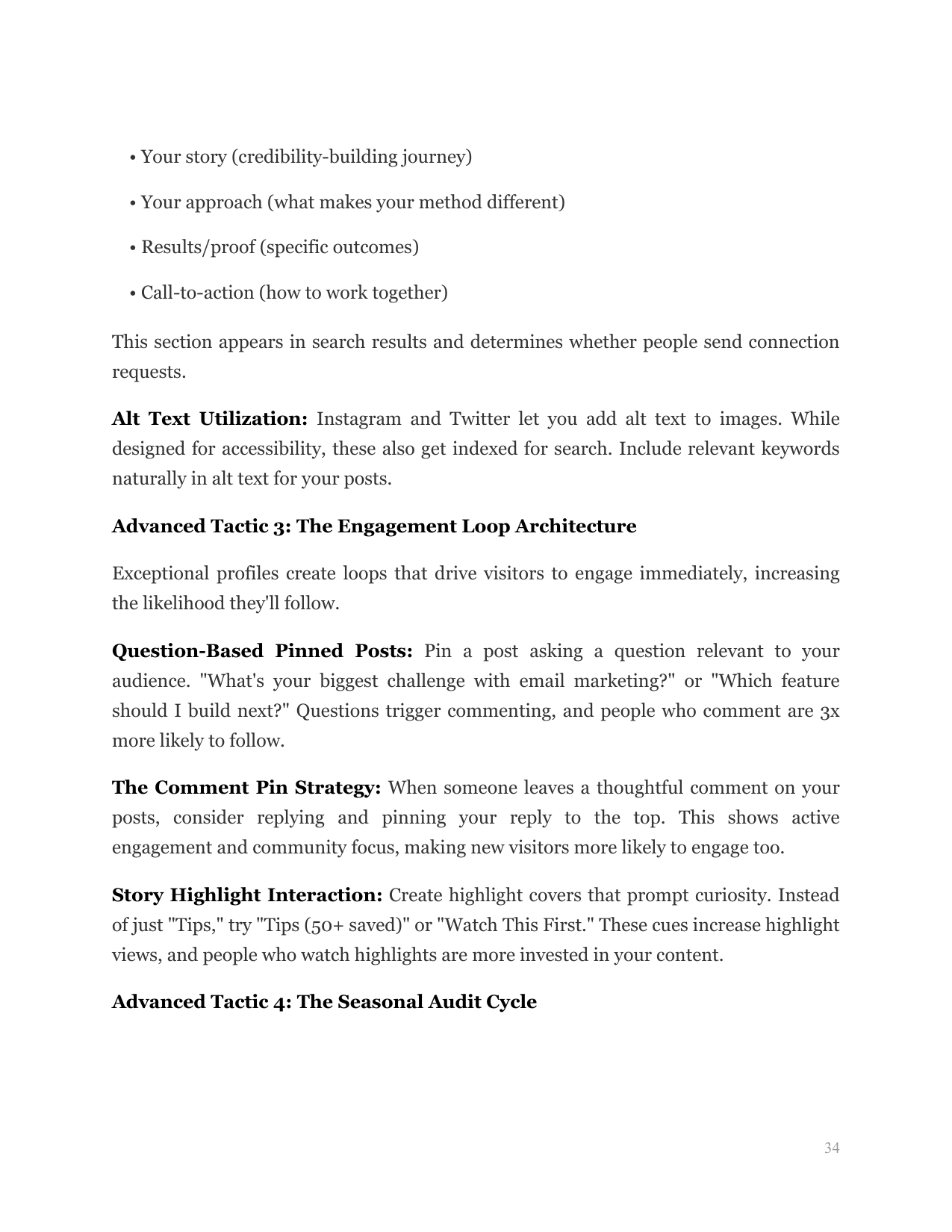 Provides step-by-step profile optimization, bio formulas, and content gap analysis beginners can execute alone.