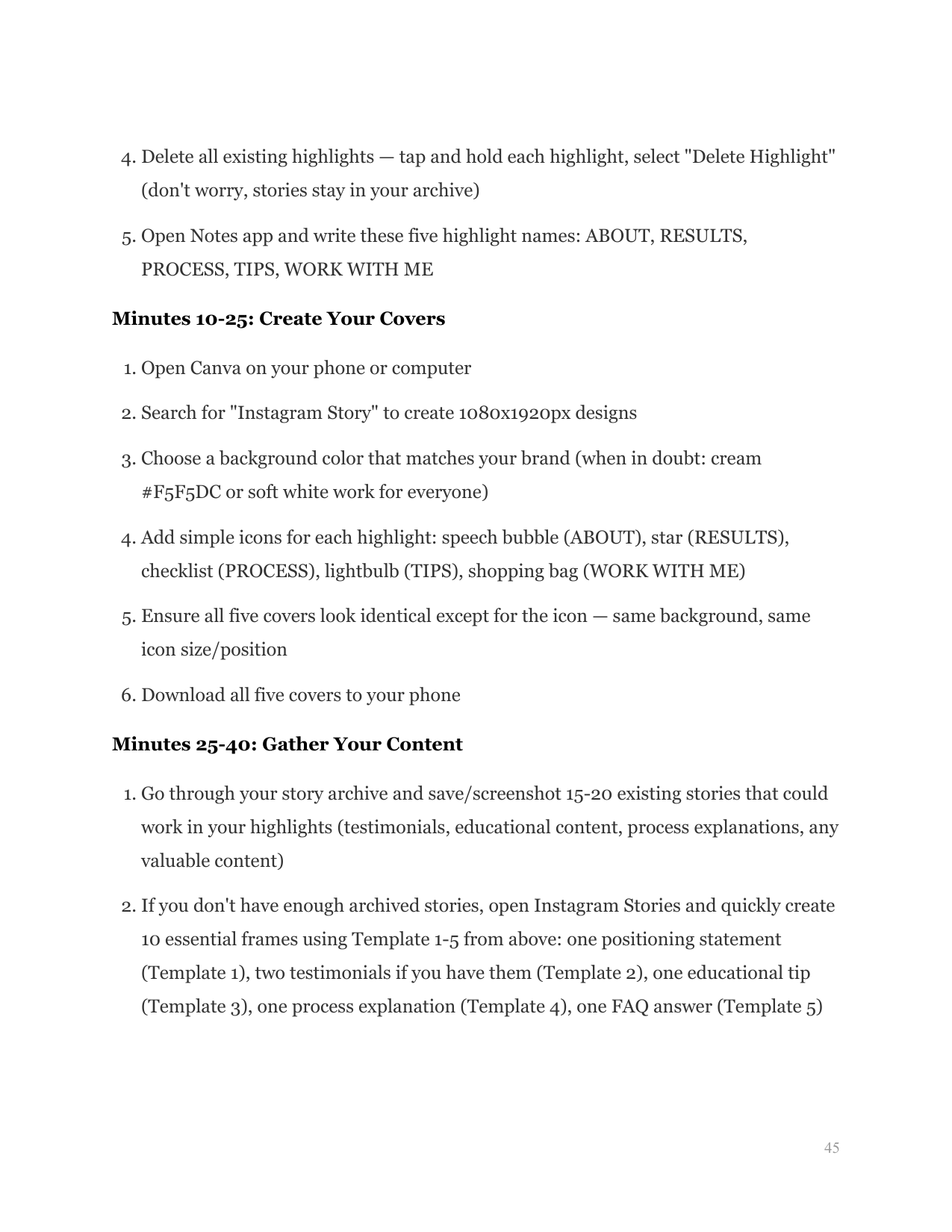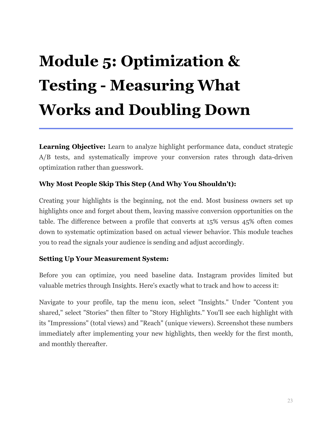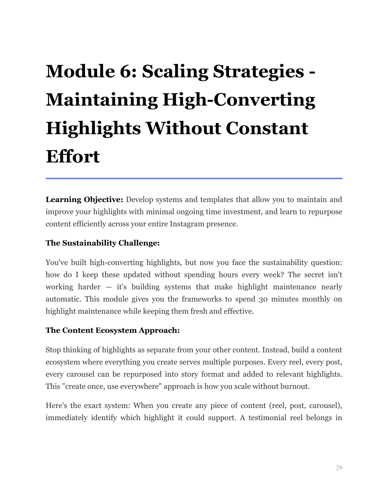 Develop systems and templates that allow you to maintain and improve your highlights with minimal ongoing time investment, and learn to repurpose content efficiently across your entire Instagram presence.