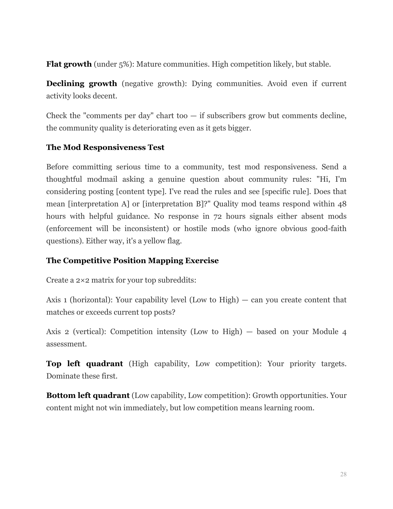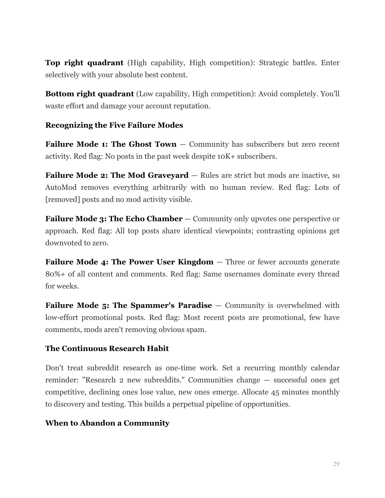 Eliminates random subreddit guessing. Covers subscriber vs. activity analysis, mod rule decoding, competition assessment, and the 'test post' framework that identifies high-opportunity communities fast.