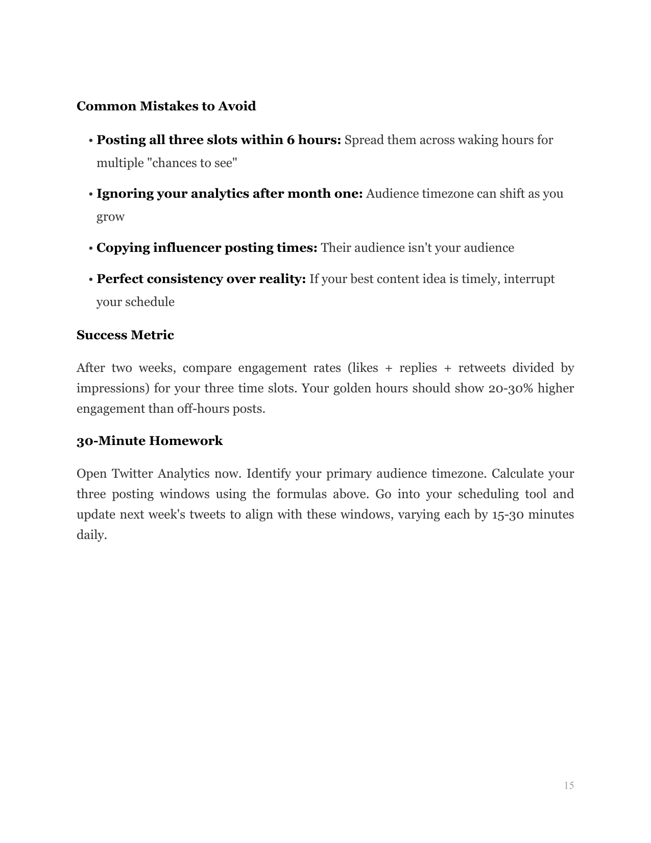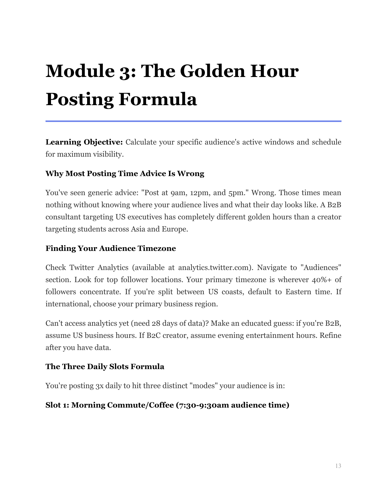 Demystifies tools like Hypefury and Tweet Hunter, teaches batching workflows, and reveals the 'golden hour' posting strategy. Covers timezone targeting, content mix ratios (80/10/10 rule), and maintaining authentic voice while automating.