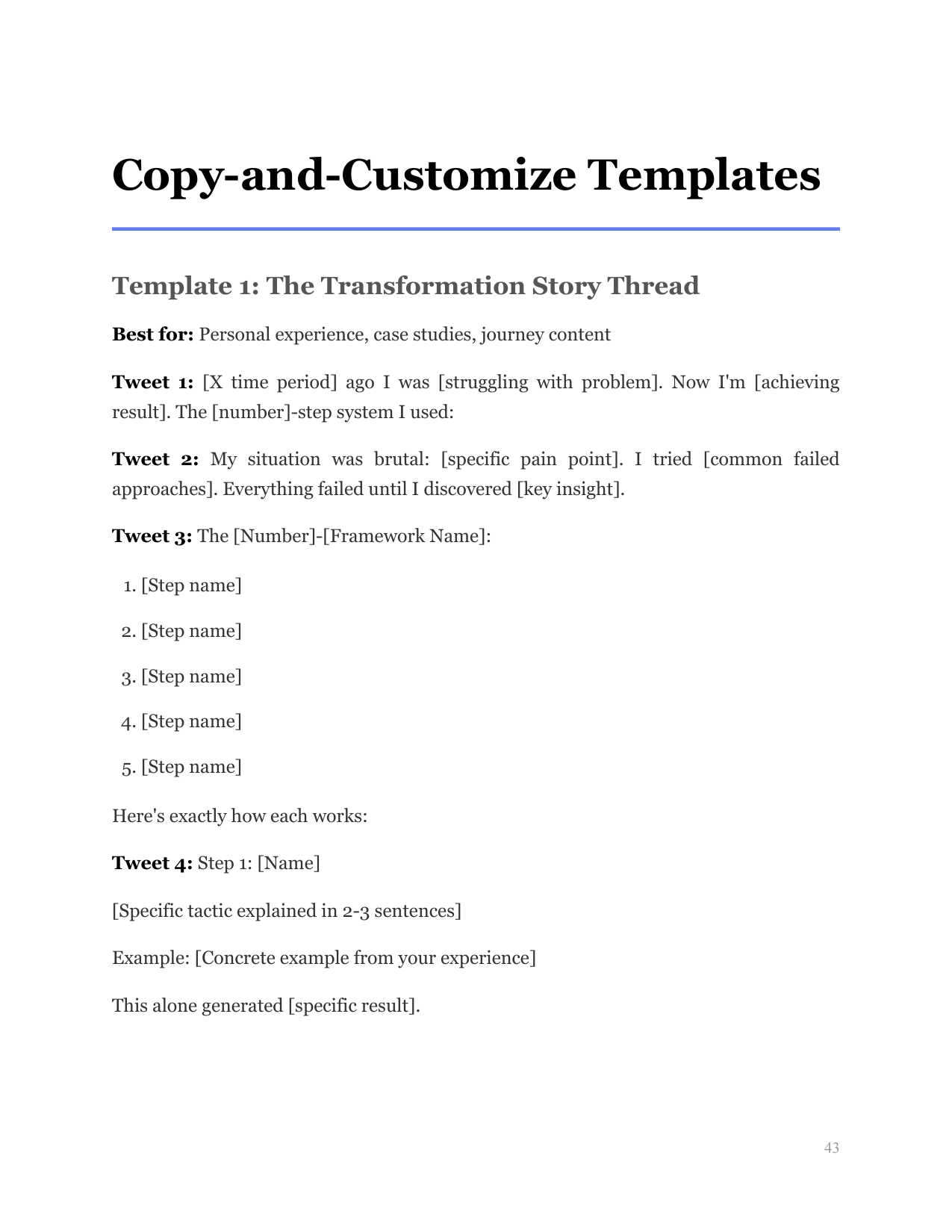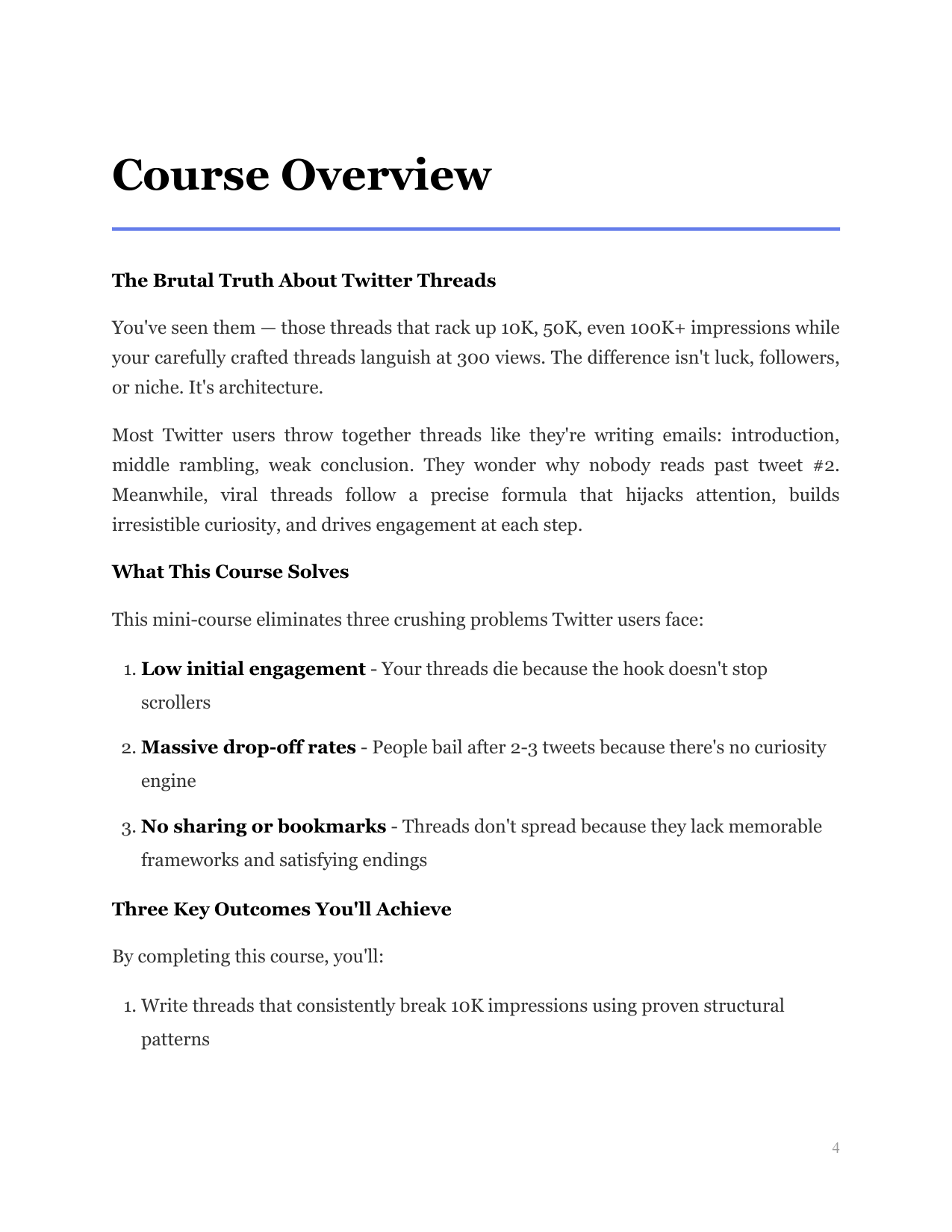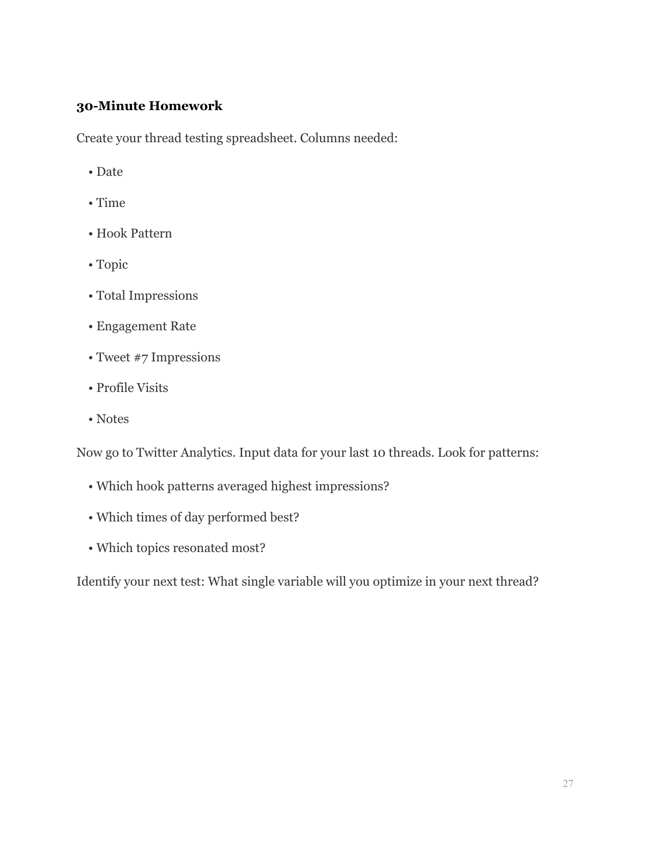 Breaks down the exact structure of viral threads—hook patterns, the 'curiosity gap' technique, numbered frameworks, and the callback close. Includes 15 proven thread templates beginners can fill in and post immediately.