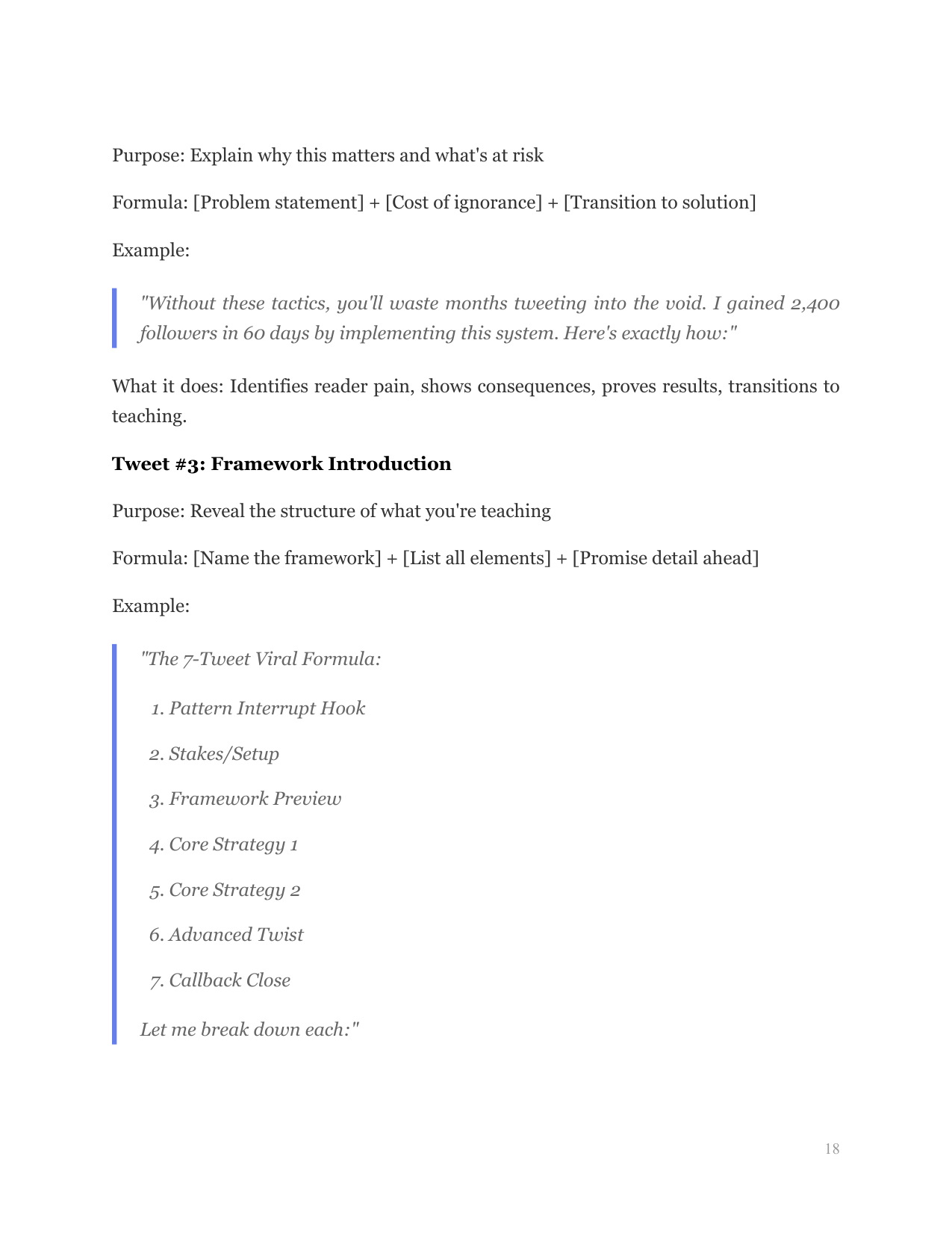 Apply the proven 7-tweet structure that consistently generates 10K+ impressions by understanding the specific purpose of each tweet position.