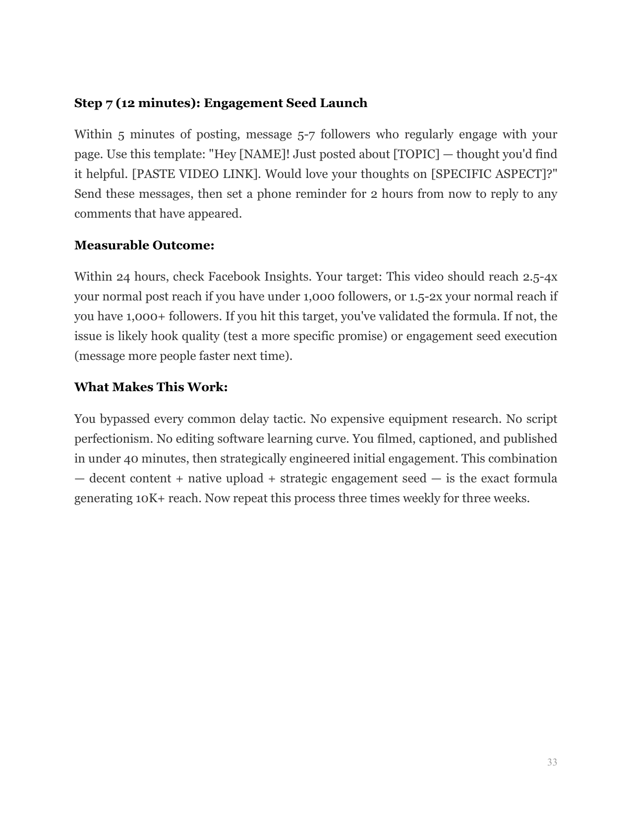 Exploits Facebook's video preference. Teaches smartphone filming for Facebook native video, caption placement, the '3-second hook' rule, and live video strategies that multiply reach instantly.