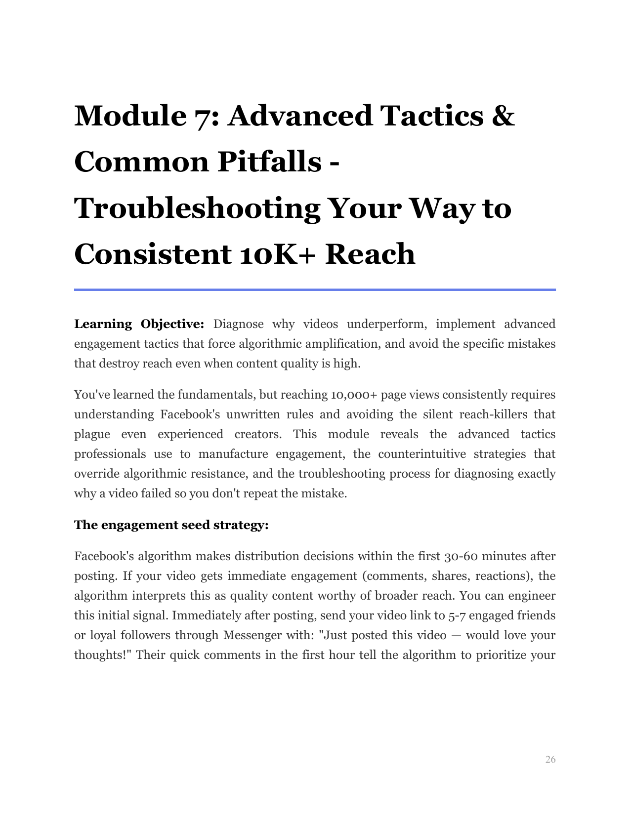 Diagnose why videos underperform, implement advanced engagement tactics that force algorithmic amplification, and avoid the specific mistakes that destroy reach even when content quality is high.