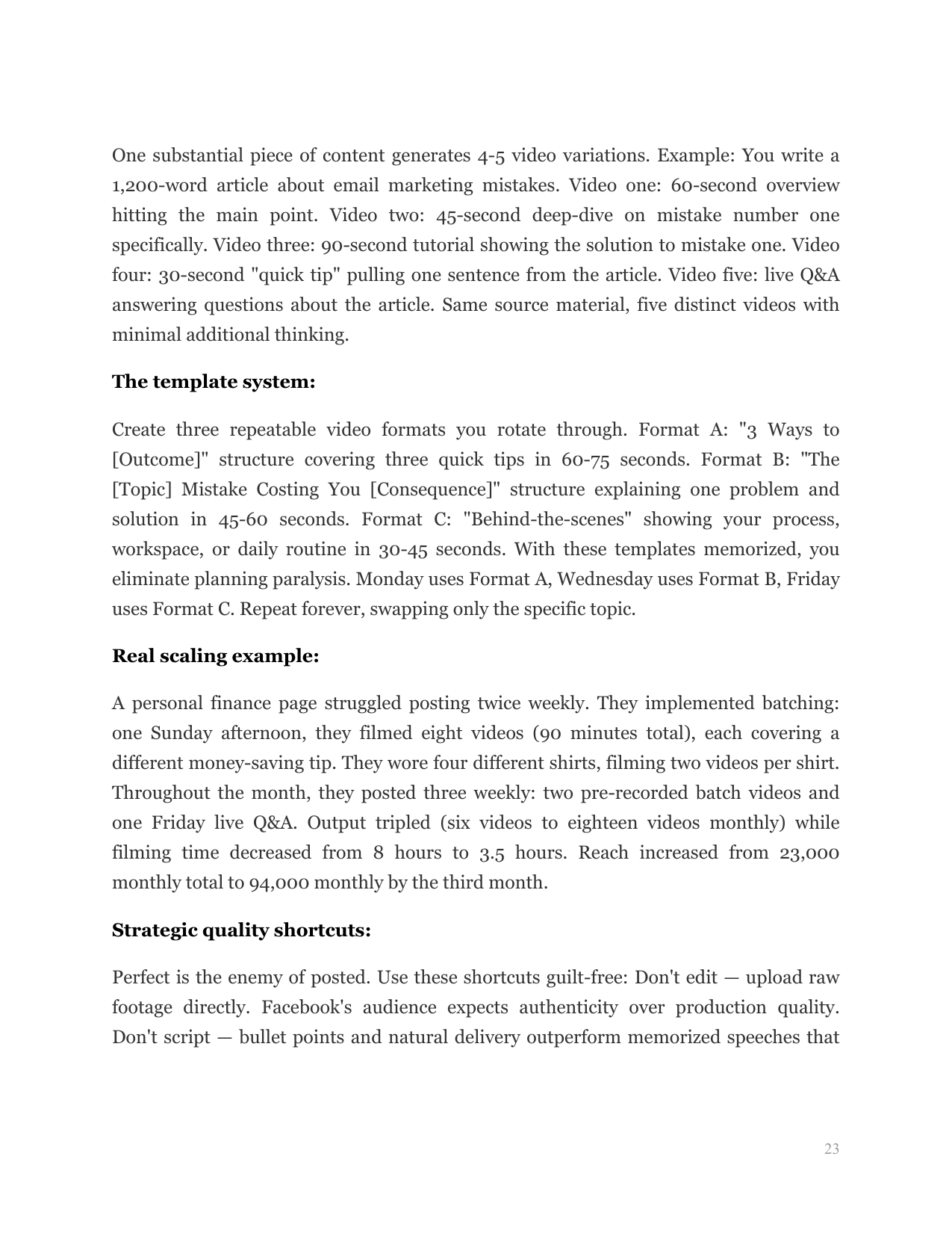 Implement batch filming workflows, content repurposing systems, and strategic shortcuts that maintain quality while tripling your video output without additional time investment.