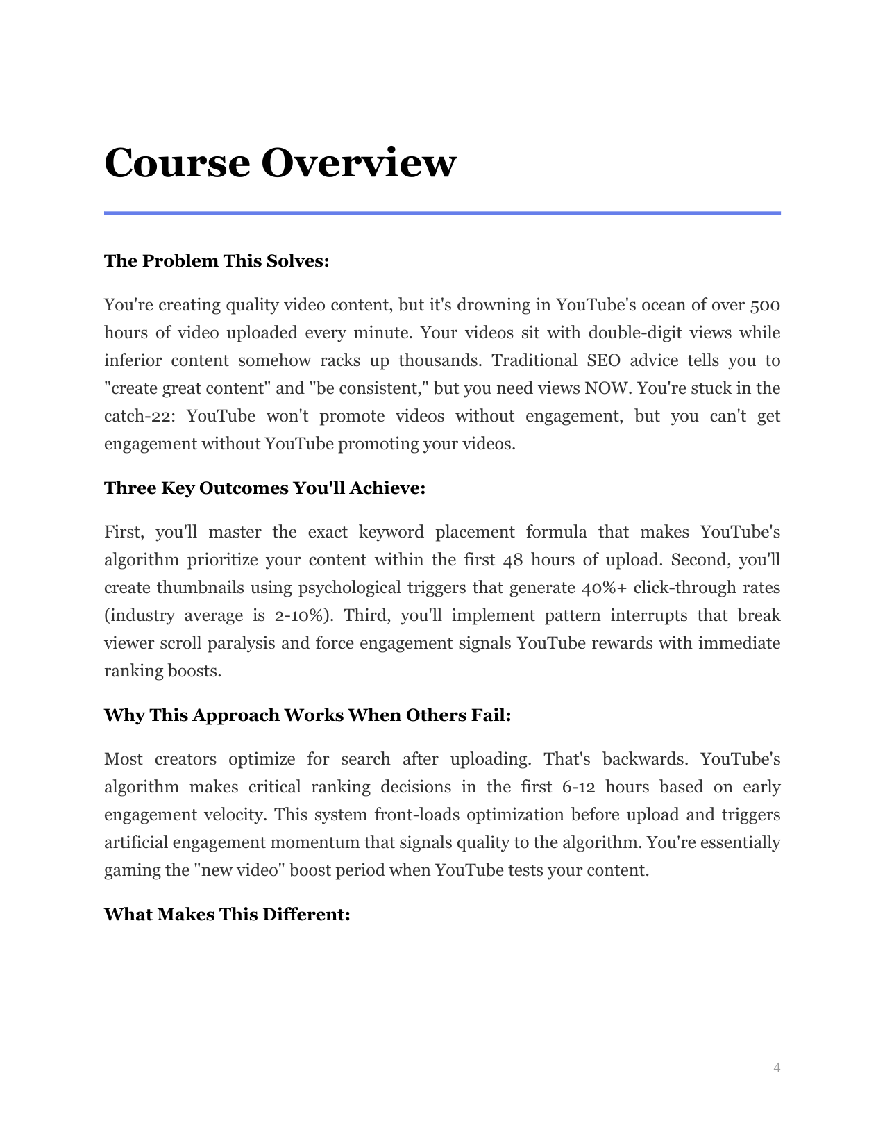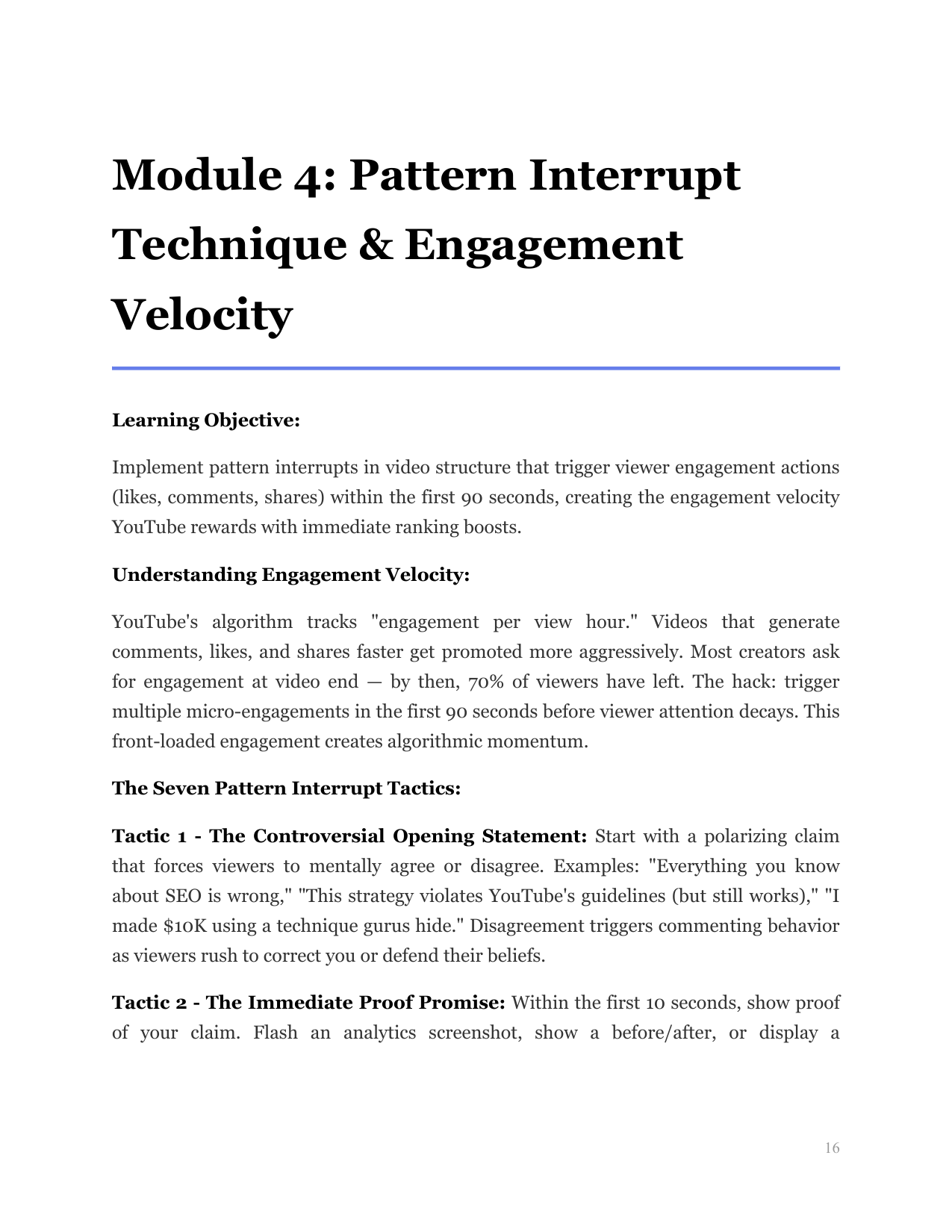 Taps the second-largest search engine. Teaches keyword placement in titles/descriptions, thumbnail psychology, and the 'pattern interrupt' that boosts click-through rates organically.